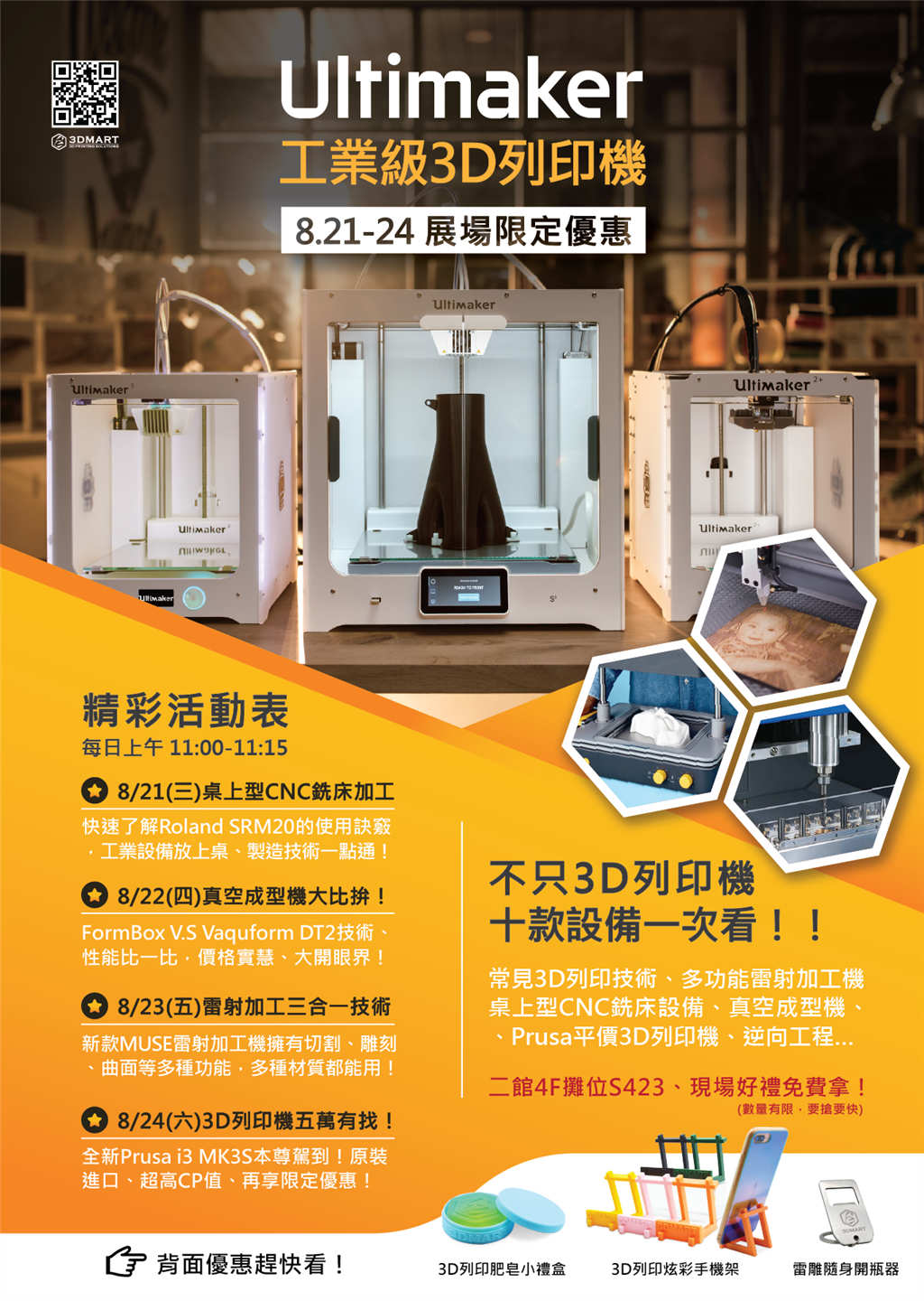 前陣子公告的8/1~8/24 3D列印展正式展開!今天前往南港展覽館的捷運上就被擠的水洩不通,從一樓到四樓都有精彩自動化、模具、3D列印等新技術(shù)可以看;不但Ultimaker 3D列印機有破天荒的優(yōu)惠方案四選一,現(xiàn)場其他設(shè)備也都各有不同優(yōu)惠,甚至包含平價的Prusa 3D列印機!倒數(shù)三天、把握展期快點來逛!