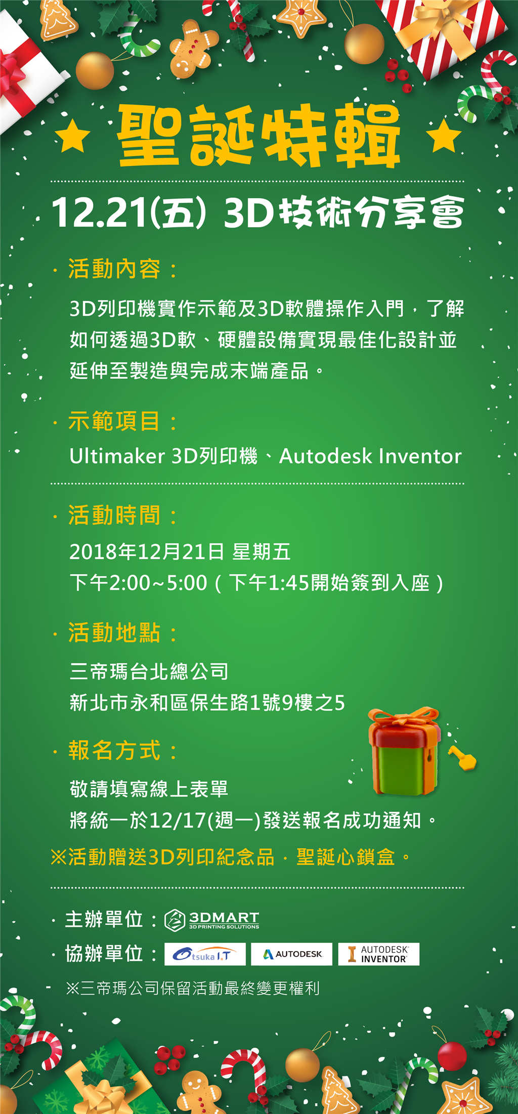 【3D列印活動(dòng)】聖誕特輯:「3D技術(shù)分享會(huì)」開放報(bào)名!額滿為止! 三帝瑪和你一起歡喜迎聖誕~今年12月21日(五)我們將與大塚資訊科技共同舉辦3D技術(shù)分享會(huì)! 現(xiàn)場(chǎng)除了能了解不同3D列印技術(shù)及應(yīng)用範(fàn)圍、各式樣品以外,還有3D列印機(jī)的實(shí)際操作(教學(xué)原價(jià)3000元以上)以及3D軟體Autodesk Inventor入門及應(yīng)用示範(fàn)(本次主題:透過(guò) Autodesk Inventor 實(shí)現(xiàn)最佳化設(shè)計(jì)並延伸至製造)。 分享會(huì)於下午1:45開放簽到入座,並於2:00開始至5:00結(jié)束,一場(chǎng)3小時(shí)的活動(dòng)讓你一次獲得3D列印的軟、硬體知識(shí),掌握從想像到實(shí)踐產(chǎn)品的串接流程,以及活動(dòng)現(xiàn)場(chǎng)購(gòu)機(jī)優(yōu)惠。 同時(shí),三帝瑪將於現(xiàn)場(chǎng)贈(zèng)送聖誕特輯紀(jì)念品──3D列印心鎖盒(介紹影片這裡看),讓你送禮沒(méi)煩惱!快來(lái)一起長(zhǎng)知識(shí)、拿好禮,一次滿足多種需求!座位有限,額滿為止! 本次活動(dòng)您將會(huì)獲得: .3種3D列印技術(shù)比較及知識(shí) .Ultimaker 3D列印機(jī)實(shí)際操作 .3D建模軟體Autodesk Inventor入門教學(xué) .了解如何從建模軟體到實(shí)際使用3D列印生產(chǎn) .活動(dòng)限定購(gòu)機(jī)優(yōu)惠 .聖誕特輯.心鎖盒送給你 ※三帝瑪將於12月17日(週一)統(tǒng)一寄送報(bào)名成功通知,敬請(qǐng)留意信件回函。 依報(bào)名優(yōu)先順序?yàn)橹?,?bào)名額滿恕不另行通知。 .活動(dòng)時(shí)間:12月21日 下午2:00~5:00(共3小時(shí)) .活動(dòng)地點(diǎn):三帝瑪臺(tái)北總公司(新北市永和區(qū)保生路1號(hào)9樓之5) .立刻點(diǎn)我報(bào)名! *將統(tǒng)一於12月17日以E-mail寄送報(bào)名成功通知 追蹤粉絲專頁(yè)、抓住3D技術(shù):https://www.facebook.com/www.jinshanghunli.com/
