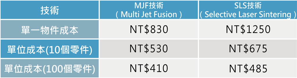 .兩種技術(shù)的少量生產(chǎn)成本相似,單一物件的MJF則較便宜