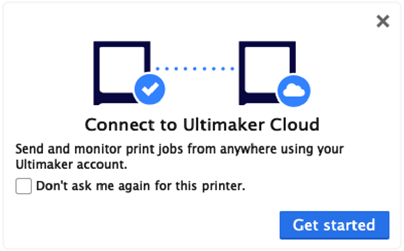 Ultimaker Cura會自動偵測到與雲端中的Ultimaker 3D列印機,在介面中會出現一個通知視窗,選取「Get Start」即可開始與Ultimaker Cloud連接。