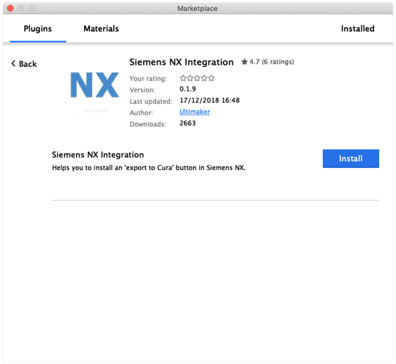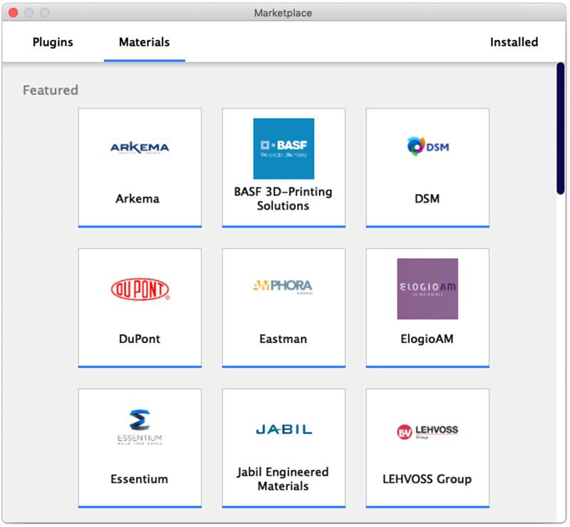 Ultimaker Marketplace中可以找到Ultimaker Cura的額外功能,其中包括用於CAD軟體的「Plugins」外掛程式、Ultimaker 3D列印機搭配使用的「Materials」材料設置。