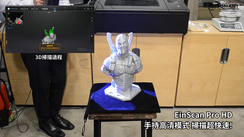 逆向操作!我們還使用Shining Einscan Pro HD手持高清模式,針對死侍模型進行3D掃描(點我看:死侍3D掃描完整記錄),環(huán)繞掃描模型的每個面向,可以依照模型大小自由移動,掃描範圍廣泛不受限;3D掃描物是黑色布料、透明玻璃、金屬反光等會影響光照結(jié)果的材質(zhì),別擔心!只要在表面噴上掃描噴粉顯像劑,就可以順利進行掃描!