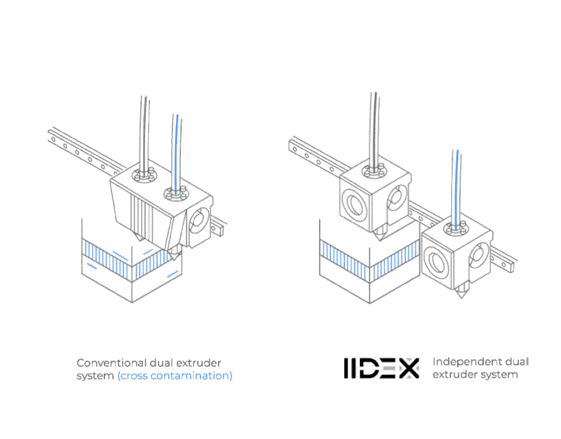IDEX(Independent dual extruders)是一種獨立雙噴頭的3D列印技術(shù),兩個噴頭系統(tǒng)完全分開、可以各別移動,運作時噴嘴的動線不會互相牽制。