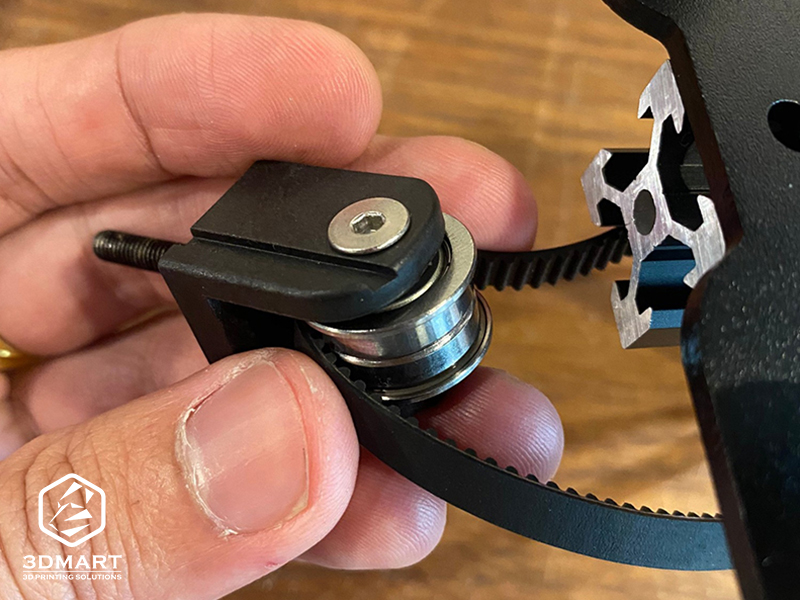 將X軸張緊器的配件全拆解後,再將輸送帶套入拉塊中。