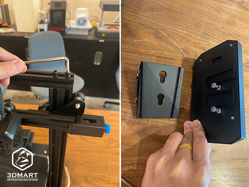 使用平圓頭螺釘M5X8、M5T型螺母,將3D列印線材架安裝於軸桿上。