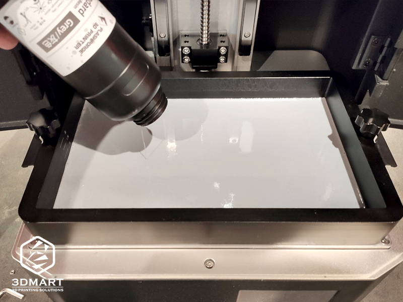 接下來,搖晃光敏樹脂並倒入樹脂槽,樹脂量可依照樹脂槽內(nèi)的標(biāo)記線為主,最後將3D列印機(jī)的遮蔽光門關(guān)上。
