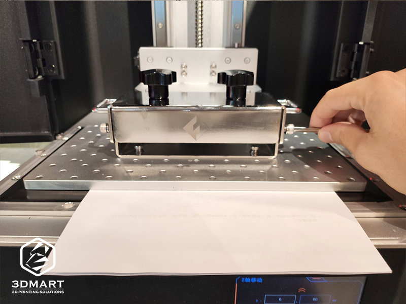 完全貼平底部紙張、LCD面板後,將載臺的固定螺絲重新鎖緊,來回抽動三張紙,以能夠抽動,但有一些阻力為標(biāo)準(zhǔn),最後點(diǎn)擊螢?zāi)簧系摹缸罡摺?,平臺會再次上升至頂部,完成Z軸校正。