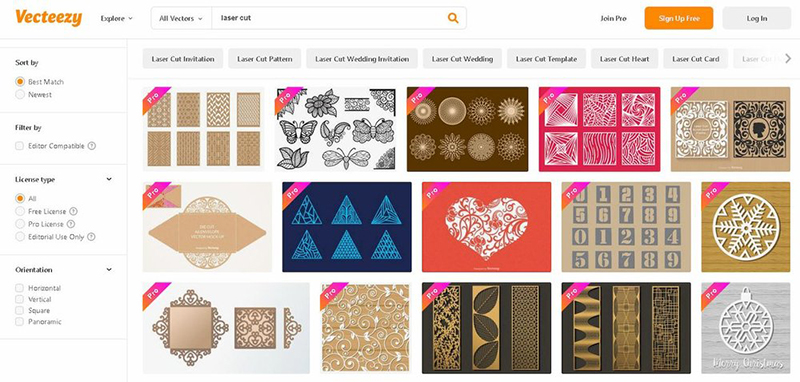 在Vecteezy網(wǎng)站上搜尋關(guān)鍵字時,有向量圖、照片或影片三種類型選擇,資料量非常大,且絕大部分都完全免費(fèi);可以下載向量圖檔,來進(jìn)行雷射切割,下載照片檔案也能直接進(jìn)行雷射雕刻,Vecteezy除了能用於雷射加工應(yīng)用,也能做為設(shè)計者日常的靈感資料庫。(點我前往)