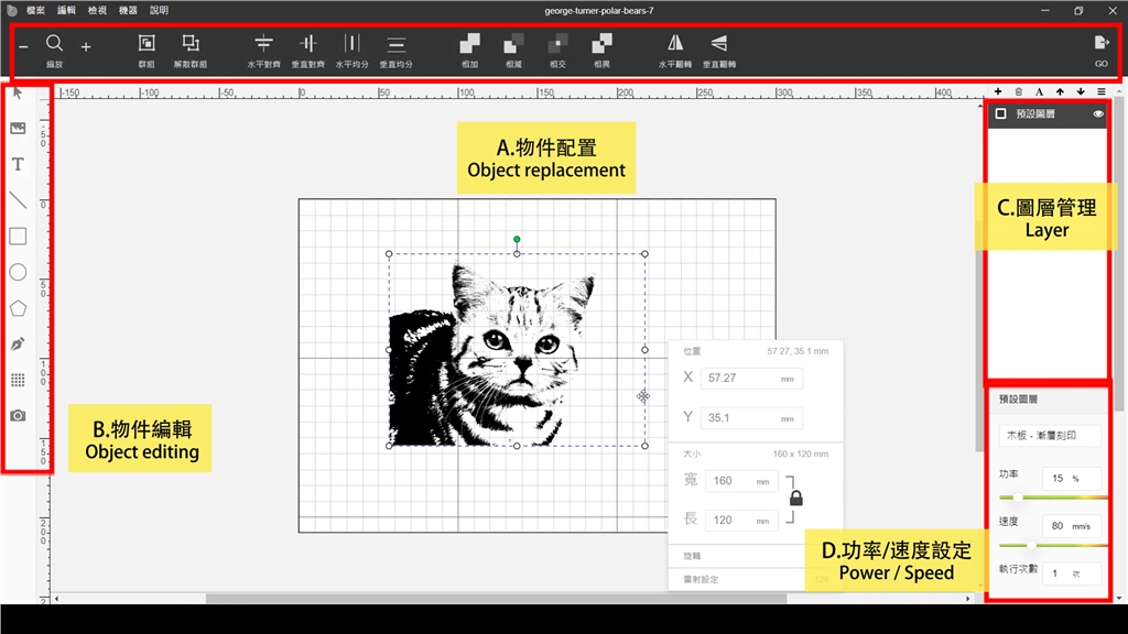 雷射雕刻前使用FLUX專用的編輯軟體Beam Studio,匯入物件後可以調(diào)整大小、設(shè)定座標(biāo)、旋轉(zhuǎn)、對齊…等多功能,「雷射設(shè)定」中也能依照需求選擇開啟漸層模式、設(shè)定曝光數(shù)值。