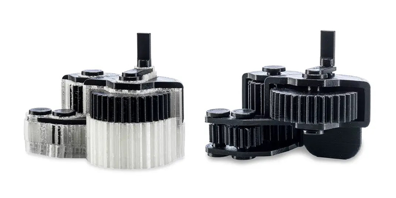 舒伯特公司(Gerhard Schubert GmbH)是頂載式包裝機(jī)「TLM技術(shù)」的先驅(qū)(點我看),生產(chǎn)許多自動化設(shè)備,常會需要可以組合、可動的工業(yè)零件,這類型的物件都會有較複雜的結(jié)構(gòu),同時對精度的要求也很高;以下這款可動的零件來說,結(jié)構(gòu)上有四個螺絲、連動的輪軸,透過雙噴頭系統(tǒng)一次3D列印完成。