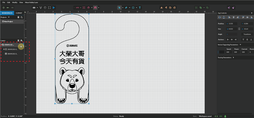 首先,可以用AI(Adobe Illustrator)軟體繪製喜歡的圖案或下載開源圖片,轉(zhuǎn)存為PDF格式後丟入MUSE的專業(yè)軟體「RetinaEngrave v3.0」。這個(gè)軟體不用下載,只需要將MUSE操控面板上的IP位址輸入到瀏覽器上就會(huì)自動(dòng)開啟,並將剛才的PDF檔置入即可。