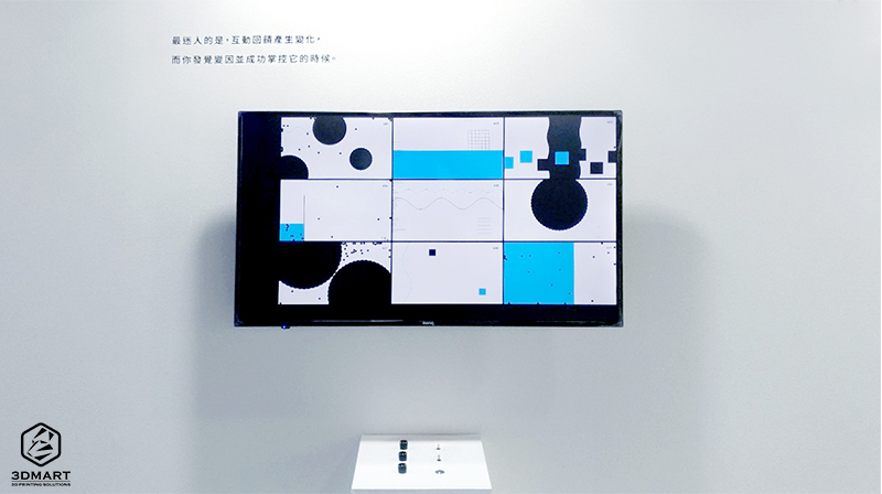 展場入口處就有許多小巧思,觸控屏中的動畫會因為觀眾的調(diào)整產(chǎn)生不同的隨機律動。而籠子裡關著許多3D列印的「反應粒子」,代表著躍動不安、活潑的要素,仔細看共使用兩種不同的3D列印線材做出不同的反光效果。(延伸閱讀:北科互動設計展,消光線材搶先看!)