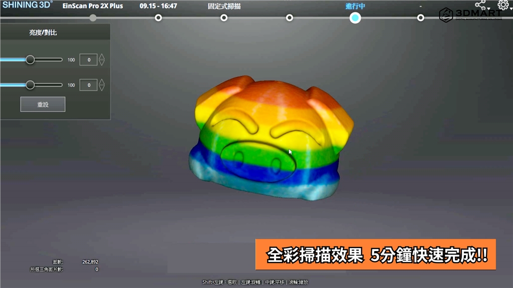 首先,我們針對(duì)彩虹小豬模型(6 x 4 x 2.5cm),使用「Einscan Pro HD」搭配專用的「彩色紋理相機(jī)」進(jìn)行彩色掃描;透過(guò)轉(zhuǎn)盤模式自動(dòng)旋轉(zhuǎn)、不必手動(dòng),5分鐘內(nèi)即可完成掃描,作業(yè)過(guò)程中也能直接在掃描軟體中,預(yù)覽彩色掃描成像結(jié)果。