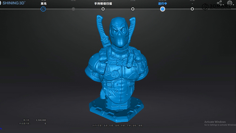 接著我們使出細(xì)節(jié)度高、結(jié)構(gòu)複雜的3D列印死侍(20 x 18.5 x 15cm),來(lái)挑戰(zhàn)Einscan Pro HD的掃描效果,使用手持高清模式,環(huán)繞掃描模型的每個(gè)面向,可以依照模型大小自由移動(dòng),掃描範(fàn)圍廣泛不受限;3D掃描物是黑色布料、透明玻璃、金屬反光等會(huì)影響光照結(jié)果的材質(zhì),別擔(dān)心!只要在表面噴上掃描噴粉顯像劑,就可以順利進(jìn)行掃描?。?a href="http://www.jinshanghunli.com/en/news/aesub-3d-scanning-powder-shining-scanner">點(diǎn)我看:自動(dòng)消失的掃描噴粉?)