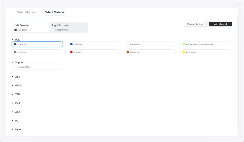從右上角的工具欄點(diǎn)擊進(jìn)入材料選擇,進(jìn)入會(huì)看到清楚詳細(xì)的材料介面,從基本到專業(yè)的都有,包含PVA、HIPS、Breakaway材料等等。以及即將要推出雙噴頭3D列印可支持的尼龍(Nylon)。