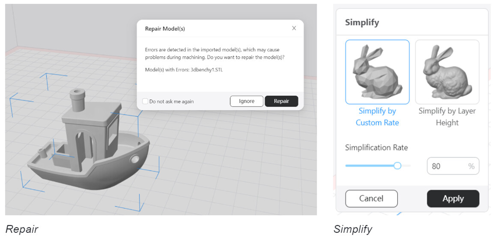 在模型修復(fù)的基礎(chǔ)上,該版本增加模型簡化功能。不必總是按照精確尺寸列印 3D模型。Luban可以自定義簡化率或?qū)痈?,並根據(jù)需要對(duì)列印精度和效率簡化地訂製所需3D模型。使用此功能可以輕鬆創(chuàng)建類似低建模多邊形的物件。