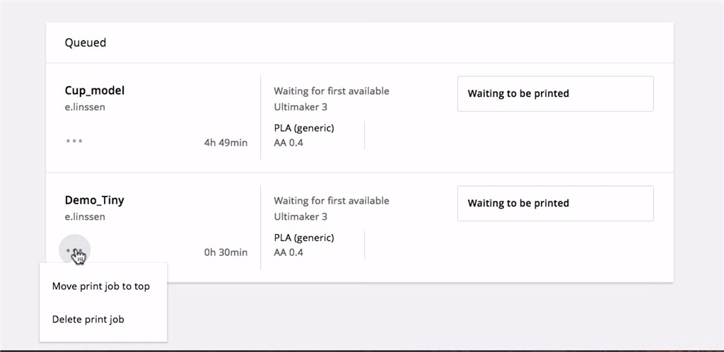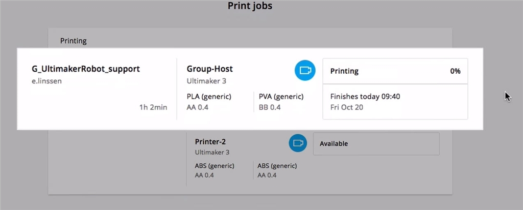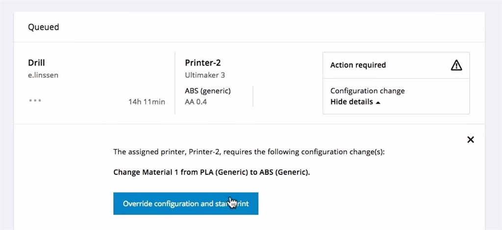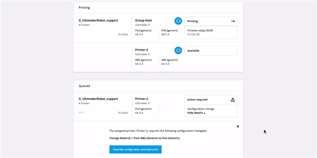 5. 下方「Queued」會顯示列印中須注意事項,以範例來說,「Printer-2」列印機需更換線材,將原本機器中的ABS線材更換為PLA線材。