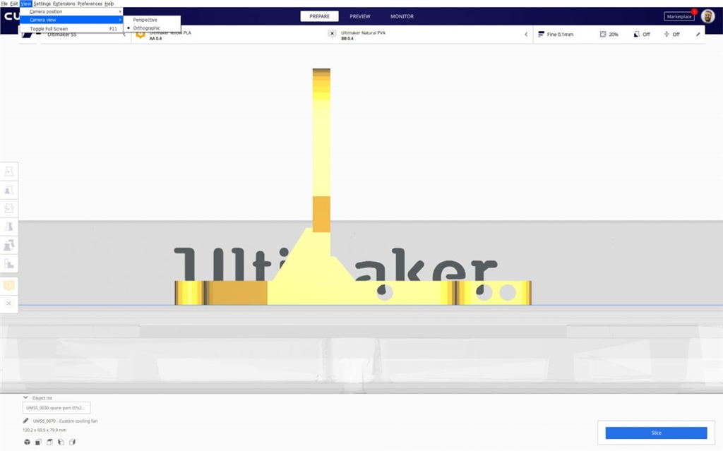 作為專業(yè)用戶,在準(zhǔn)備列印時(shí)需要對(duì)3D視圖類型進(jìn)行更多控制,Cura 4.2引入了正視圖功能 - 與專業(yè)CAD軟體使用的視圖類型相同,因此您可以輕鬆地將模型的尺寸與CAD設(shè)計(jì)進(jìn)行比較。 在「檢視>相機(jī)檢視>正視圖」中找到這個(gè)選項(xiàng)(實(shí)際名稱與位置將以Cura 4.2正式版為主)。