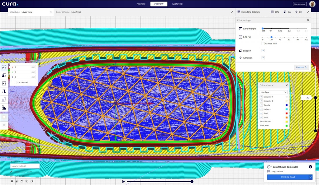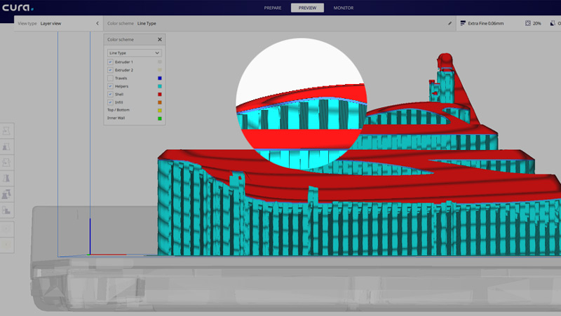 預(yù)覽視圖中的填充和支撐界面現(xiàn)在有新的配色選擇,可以更容易在複雜的模型中區(qū)分它們。填充線現(xiàn)在顯示為橘色,支撐界面則以藍(lán)色做出區(qū)別;這項(xiàng)功能在上方的「顏色方案」>「線條類型」中可以找到。