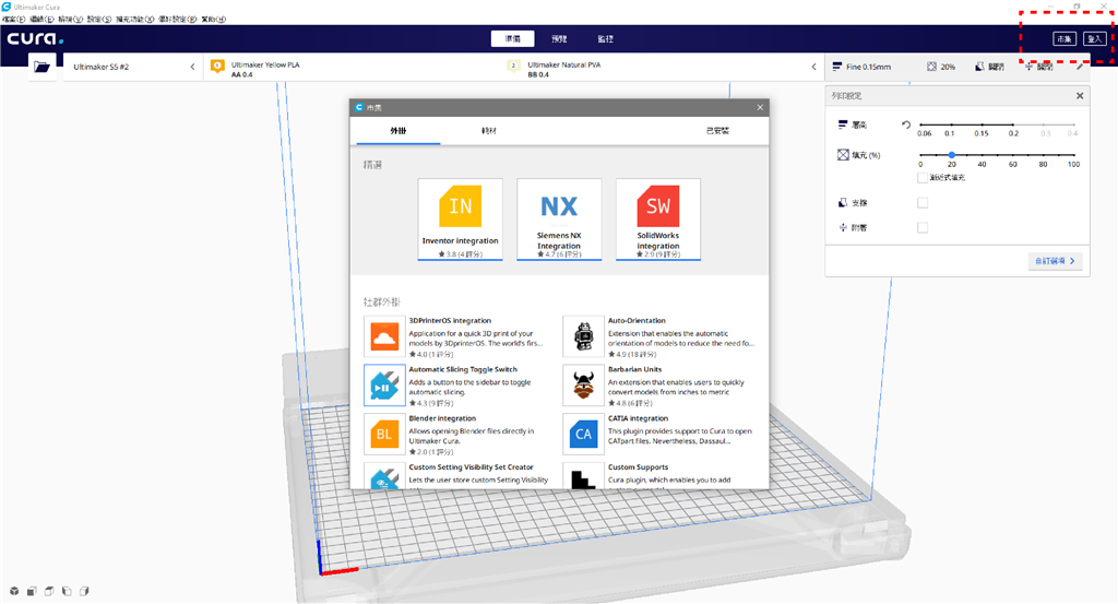 各式軟體外掛能依需求提供個人化調(diào)整,例如:有些外掛能銜接CAD和Ultimaker Cura,方便工程師、設(shè)計師直接將3D圖檔進(jìn)行列印切片、讓步驟更簡單。Ultimaker也貼心的意識到,下載及安裝是初學(xué)者常見的入門障礙,因此新版的Cura中已經(jīng)整合這些功能,打開Cura後就能在介面的右上角找到。