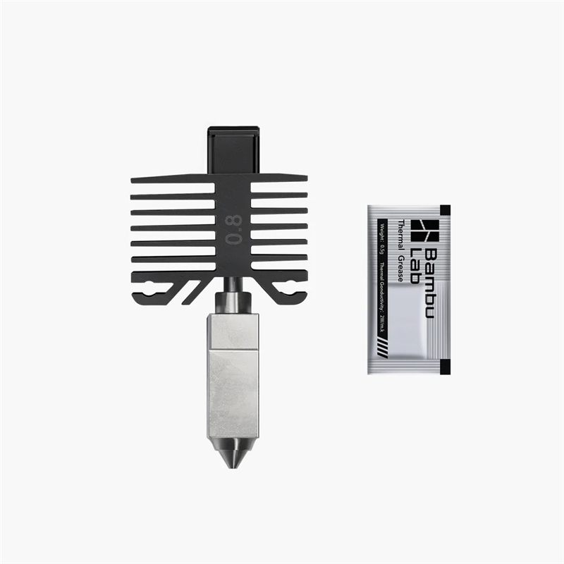 帶不鏽鋼噴嘴的熱端組件採用的一體成形設(shè)計(jì)。僅適用於Bambu Lab 3D列印機(jī)。噴嘴集成到模組中,並透過細(xì)金屬連接到散熱器,已獲得最佳性能。有了這種設(shè)計(jì),模組的加熱速度會(huì)比普通的模組快得多,而且一體成形設(shè)計(jì)有效地減少更換噴嘴可能的問題。散熱片採用高導(dǎo)熱鋁合金,喉部採用TC4鈦合金。噴嘴由銅合金和不鏽鋼組合製成,在保證硬度的同時(shí)可大流量列印。