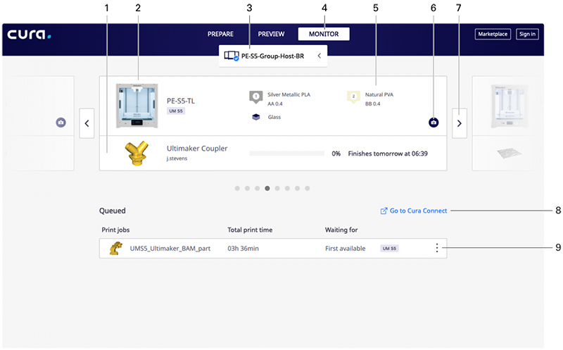 Ultimaker Cura的監(jiān)控功能可以隨時查看3D列印時模型的狀態(tài),可以檢查每臺3D列印機的運作狀況、工作排程。