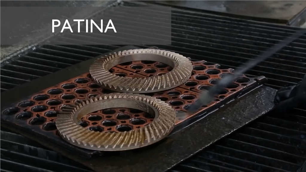 .對於青銅零件,會(huì)塗上一層硫化鉀鹽;放入另一個(gè)烤箱烘烤後,加入一層三價(jià)鐵,最後塗覆保護(hù)劑以保持表面光亮。