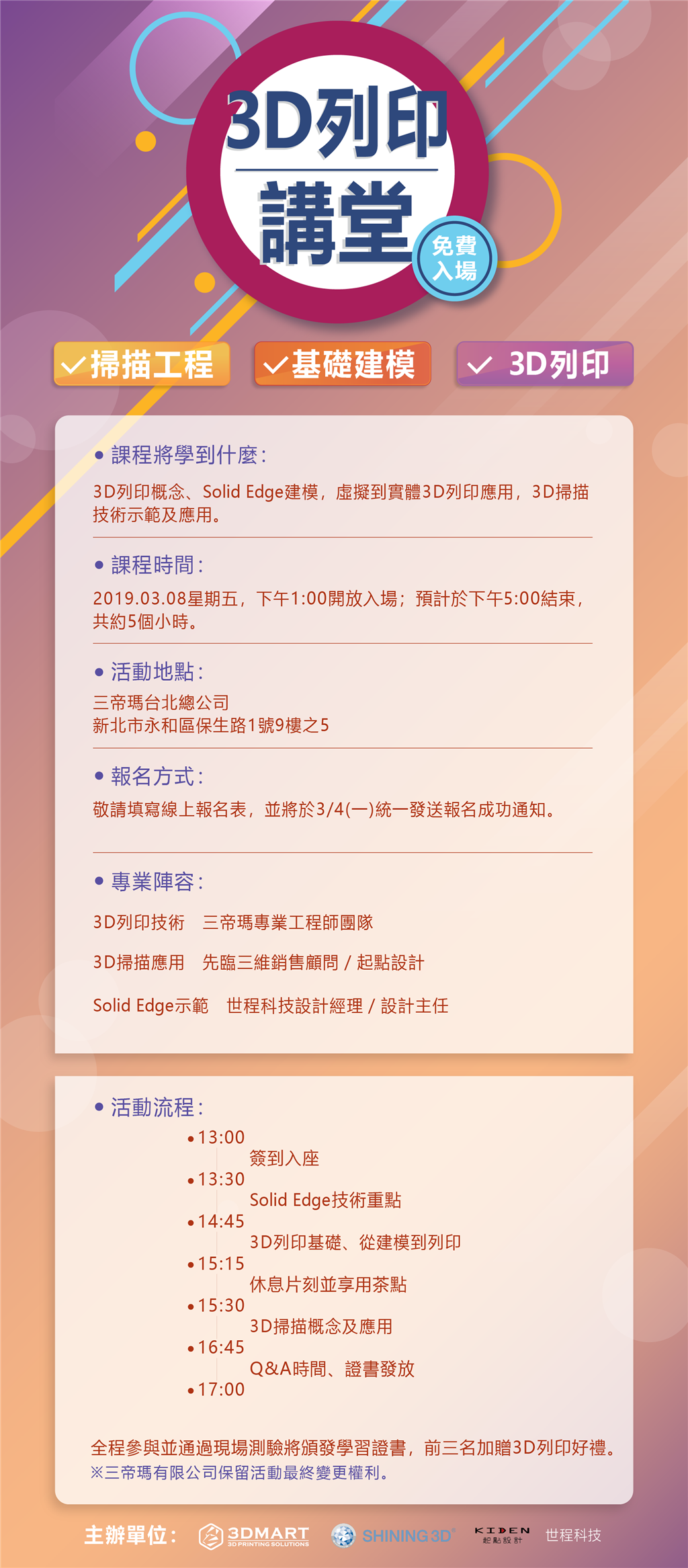 【3D列印講堂】列印、建模、掃描大集合?!火熱報名中! 上次的3D列印講堂活動反應熱烈,非常感謝大家的參與!這次的3D列印講堂活動將增加新的內容與合作夥伴,各界專家來上課,三合一大補帖!本次三帝瑪特別邀請到掃描器顧問與建模專家,針對不同領域共同和各位分享如何將虛擬與實務串聯(lián)。其中包括3D掃描工程、Solid Edge建模、3D列印串聯(lián)等技術說明,歡迎各位一起來了解最新的3D列印科技: 本次活動將於2019年3月8日,星期五下午1:00開放入場,採先到先選位、自由入座;地點位於三帝瑪臺北總公司(地圖),教學結束後會進行隨堂測驗,大家務必要認真聽講喔!通過測驗者將頒發(fā)3D列印技術學習證書,前三名還可獲得精美3D列印小禮物! 想學習3D列印技術?想了解3D掃描器如何使用?3D列印、建模、掃描三合一!大好機會別錯過,線上報名快點我!座位有限、額滿為止! .報名點我! 我們還會持續(xù)和大家分享與3D列印有關的各項新資訊及實測,所有最新消息都會公布於我們的粉絲專頁! 追蹤粉絲頁、好康不漏接:https://www.facebook.com/www.jinshanghunli.com/