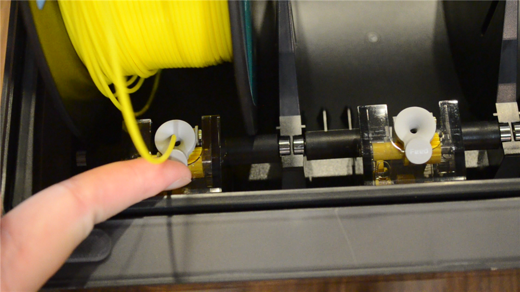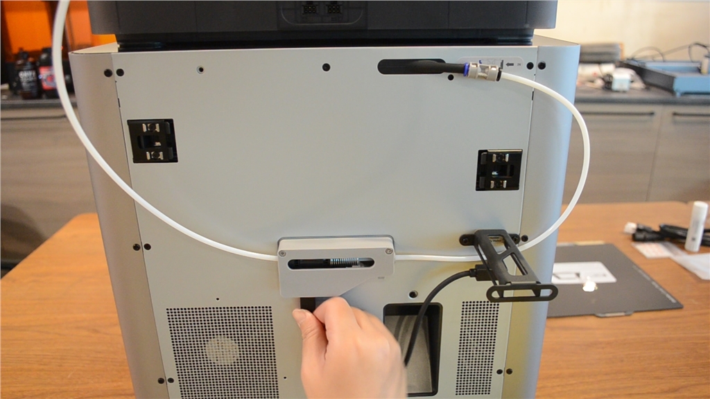 撥開白色部分的線材進(jìn)口卡榫,將線材插入一定長度即可,AMS會自動偵測線材材質(zhì)。