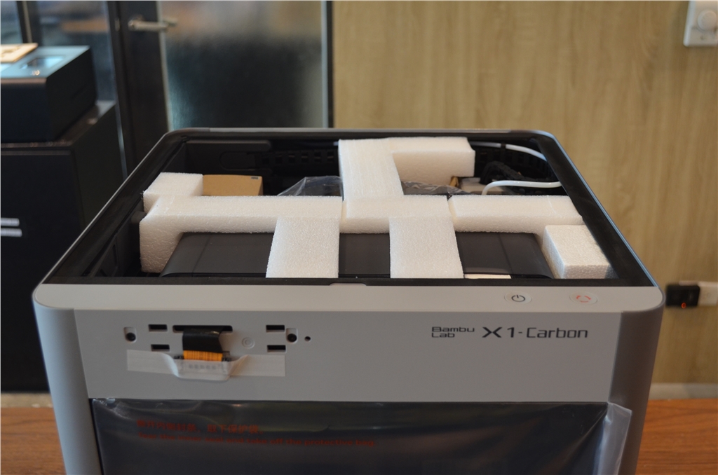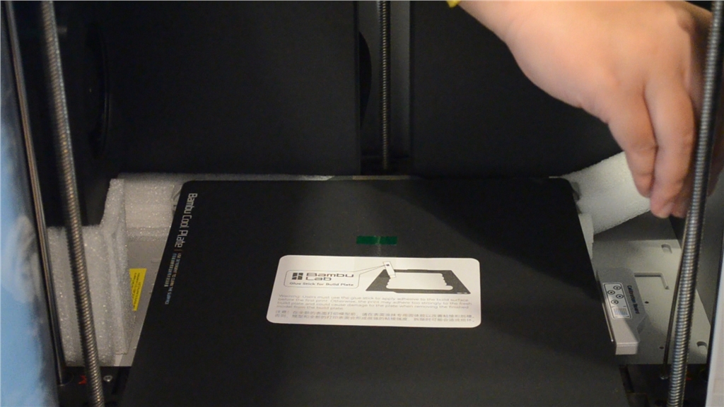 打開玻璃門,下方有紅色箭頭,兩個螺絲需要先轉(zhuǎn)開。AMS就可以從上方取出。撕下列印頭的保護(hù)紙板,取出線材清洗槽的泡棉。