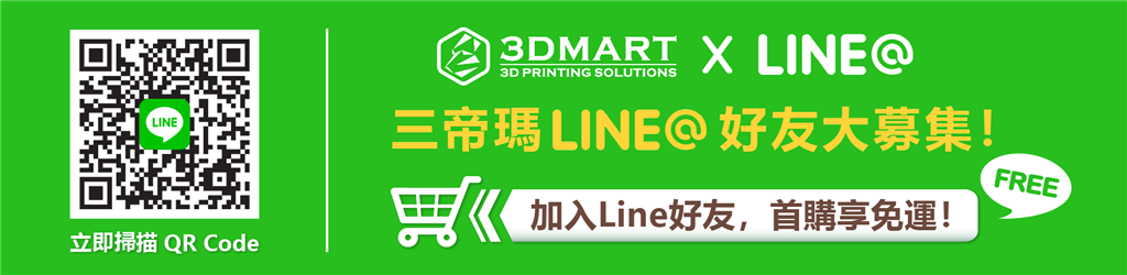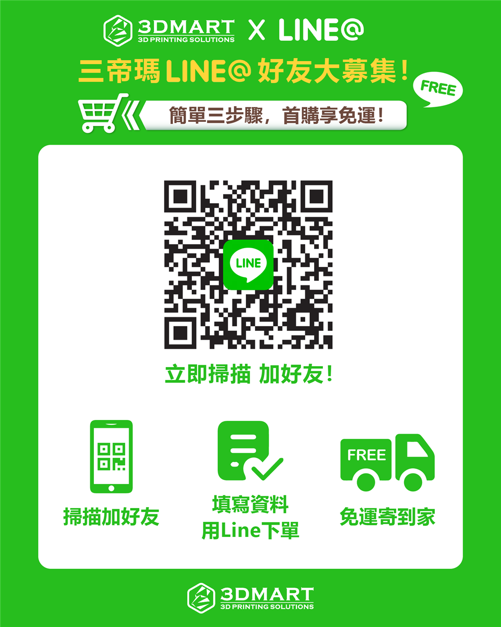 【3D列印優(yōu)惠】官方帳號(hào)上線啦!好友首購享免運(yùn)! 三帝瑪現(xiàn)在也有官方Line帳號(hào),讓商城購物更方便囉!快來加入3D列印生活圈,好友首次購物即享免運(yùn)優(yōu)惠,3D列印線材、樹脂、配件通通有!快來加入Line好友! 好康只要三步驟!活動(dòng)辦法帶你看: 1.掃描QR Code,加入官方Line好友。 2.輸入姓名、e-mail及電話(此為訂單及聯(lián)絡(luò)憑證,敬請(qǐng)確實(shí)填寫),用Line傳送商城購物內(nèi)容。 3.享受免運(yùn)優(yōu)惠,等待商品寄到家! *三帝瑪公司保留所有活動(dòng)最終變更權(quán)利。 *注意事項(xiàng):本活動(dòng)僅適用於商城購物內(nèi)容;不包含代印服務(wù)、掃描服務(wù)及技術(shù)支援,以上服務(wù)仍需進(jìn)入官網(wǎng)系統(tǒng)才可成立訂單。 .代印服務(wù)點(diǎn)我 .掃描服務(wù)點(diǎn)我 .技術(shù)支援點(diǎn)我 追蹤粉絲專頁、抓住3D技術(shù):https://www.facebook.com/www.jinshanghunli.com/