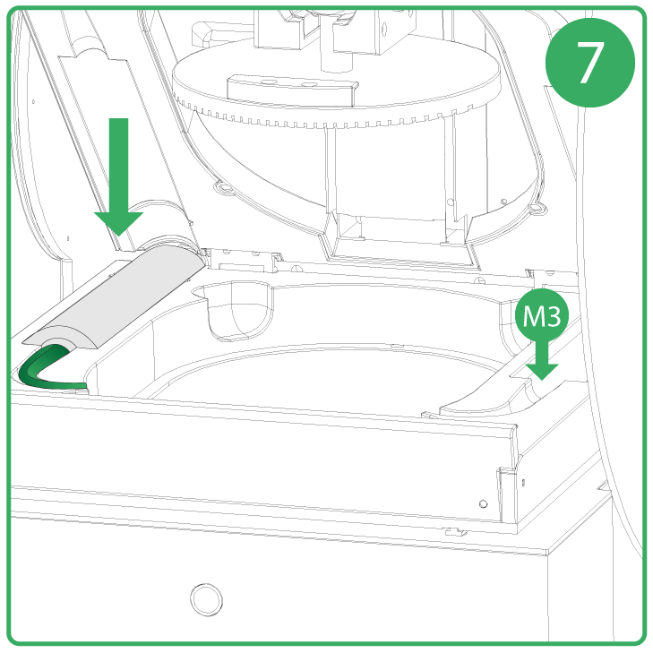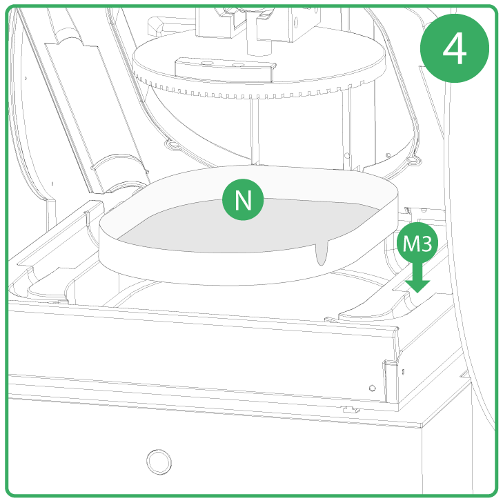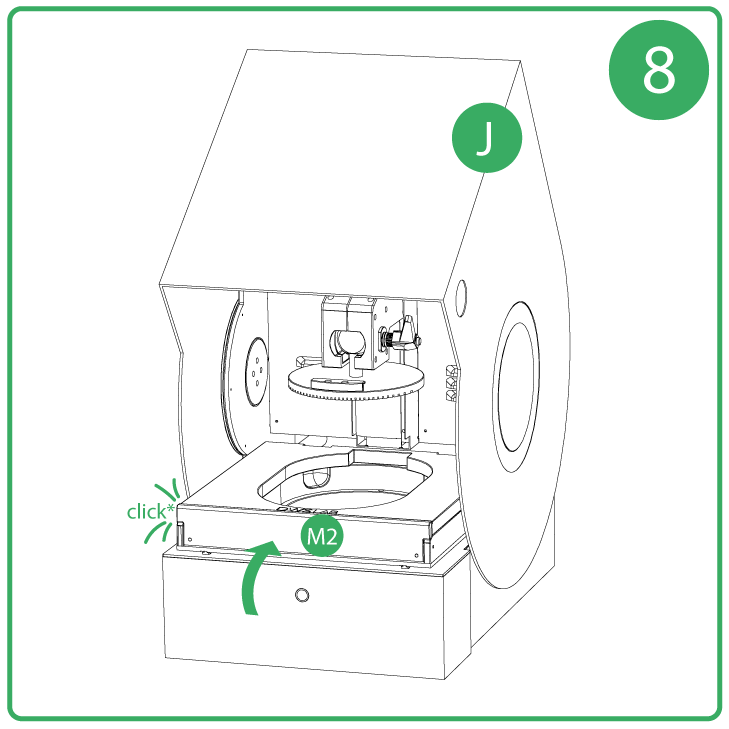 九、列印準(zhǔn)備 ①3D列印機(jī)啟動(dòng) 1. 打開列印機(jī),啟動(dòng)Fictor並按開門鍵(“Open”)。 2. 提起列印機(jī)遮罩(J)。 3. 將固定樹脂匣(M1)上蓋的樹脂盒卡扣(M2)往使用者的方向拉起。 4. 將樹脂槽放入列印機(jī)內(nèi)(N),確保凹槽與樹脂匣(M3)的外殼吻合。 5. 搖晃樹脂並取下樹脂頂部的綠色蓋子(R)(不要取下保護(hù)膜)。 6. 將噴嘴(S)按壓到位,直到完全插入,然後如圖所示旋轉(zhuǎn)噴嘴。 7. 按照標(biāo)籤上的說明(要列印在樹脂標(biāo)籤上的指示後要檢查的項(xiàng)目6和7)將樹脂插入樹脂匣(M3)中。 8. 按下樹脂匣上蓋(M1)將其關(guān)閉。檢查樹脂盒卡扣(M2)確認(rèn)上蓋已被鎖定。 ②平臺(tái)定位(移除階段) 1. 檢查平臺(tái)是否乾淨(jìng),並使用專門提供的梳子和用酒精(乙醇)沾濕的無絨布清除乾燥的樹脂殘留物。 2. 將平臺(tái)旋鈕(K1)插入相應(yīng)的孔洞(T),使U處於水平位置,然後按直到完全插入。 3. 向用戶方向拉動(dòng)鎖定桿(L),使平臺(tái)移動(dòng)旋轉(zhuǎn)到水平位置上(K)。 注意:在這個(gè)階段不要鎖定平臺(tái)。 4. 放下列印機(jī)遮罩(J)。
