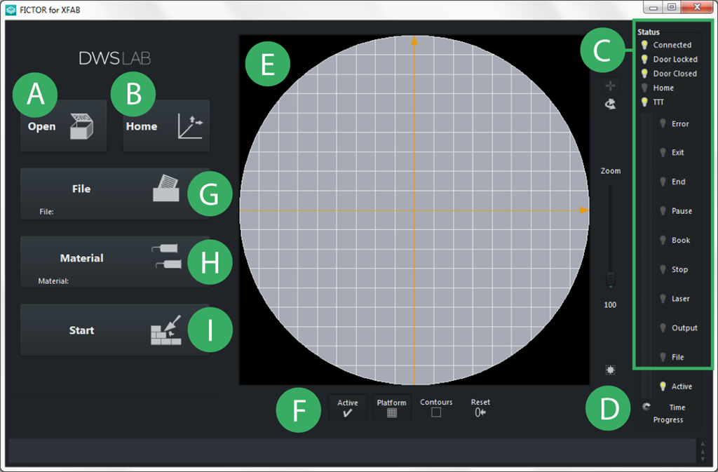 五、列印機(jī)管理 要下載列印機(jī)軟體,請(qǐng)按以下步驟操作: 1.前往customers.dwssystems.com頁面 2.如有必要,請(qǐng)點(diǎn)擊“Sign in”並輸入用戶名和密碼進(jìn)行登錄。 3.點(diǎn)擊“Software”。 4.下載“Fictor”軟體(PC最低要求:Windows7 SP1或更高版本,OpenGL顯示卡,雙核處理器,USB連接端)。 5.下載“Nauta”軟體(*)(32位元或64位元,取決於操作系統(tǒng))。 6.前往您的下載文件夾,點(diǎn)擊剛下載的安裝程式來進(jìn)行安裝下載程序。 7.要索取安裝所需的代碼,請(qǐng)點(diǎn)擊“Licences”。 (*)查看“Nauta”軟體手冊(cè),前往協(xié)助選單(View Help),在程式裡面。 初始化“Fictor”程式時(shí)(警告:初始化時(shí)程式可能請(qǐng)求管理員權(quán)限,Windows提示時(shí)回答YES),主螢?zāi)粚⒋蜷_,並顯示以下: A. 打開外殼鑰匙。 B. 列印機(jī)初始化鍵。 C. 列印機(jī)狀態(tài)指示燈。 D. 列印狀態(tài)指示器。 E. 建模平臺(tái)顯示。 F. 顯示用戶設(shè)定控制區(qū)(參考E)。 G. 3D列印文件選擇鍵。 H. 列印材料選擇鍵。 I. 列印開始鍵。