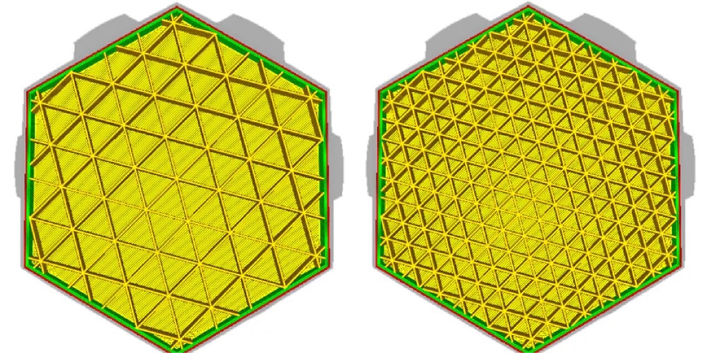 3D列印空心的物件時,內(nèi)部需要搭配填充結(jié)構(gòu)來做為主要架構(gòu),在Ultimaker Cura中有不同的填充模式,可以依照需求修改密度。
