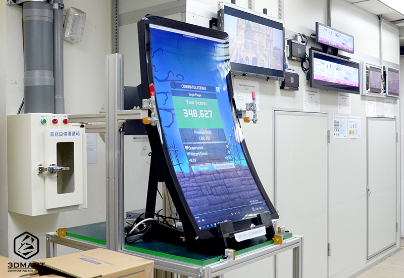 (研華科技進(jìn)行遊戲測(cè)試中的大型曲面觸控式屏幕。)
