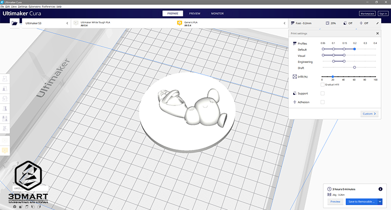 首先,我們修改了「雪寶」的開源檔案,在Ultimaker Cura中可以看到這個雪寶沒有樹枝手臂和鼻子、頭毛,要等到巧克力身體完成才會畫上。