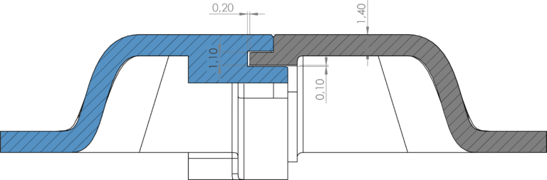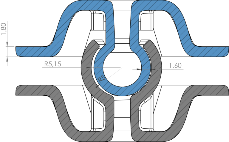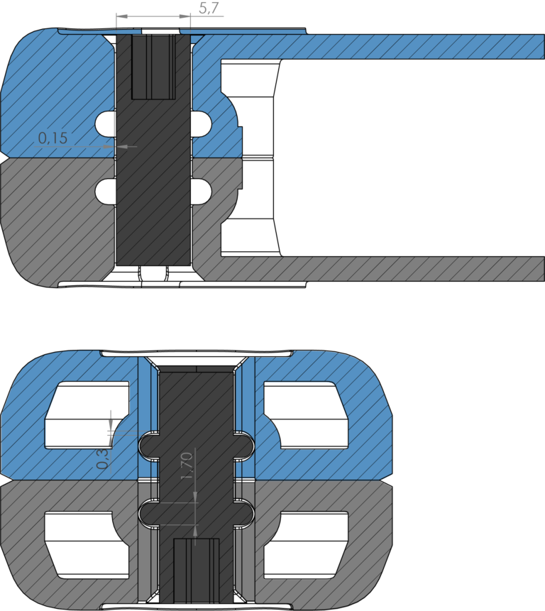 (藍色線圖對應右側(cè)分件、灰色線圖則對應左側(cè)分件,利用些微凸起的三角型同時形成凹槽與卡溝的設計。)
