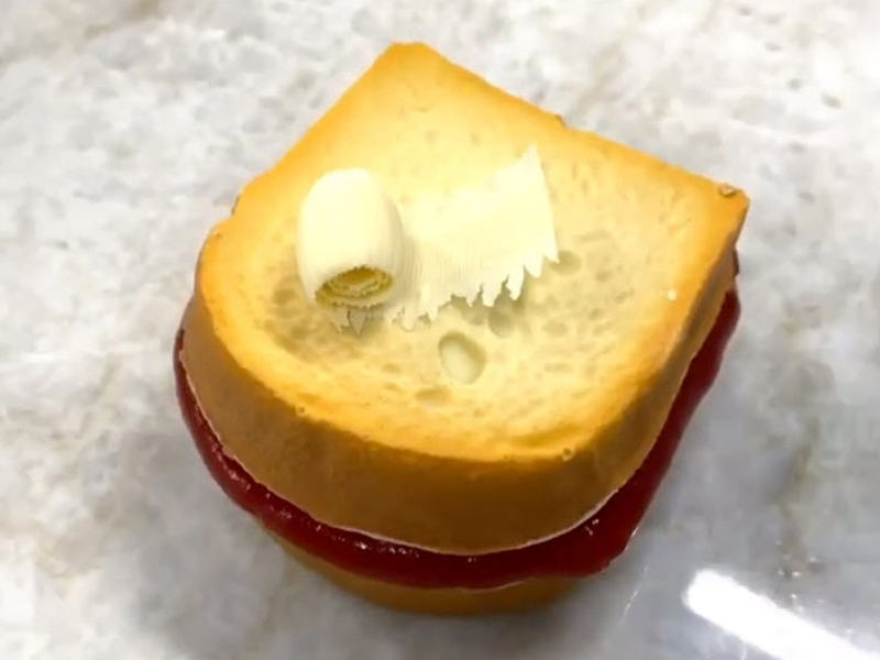 艾莫里師傅重複以上的動(dòng)作,分別製作三明治外皮造型、核桃花生果仁糖的內(nèi)餡,並在周圍擠上草莓果醬,最後噴上甜點(diǎn)專用的食用噴漆,仿真程度超高;經(jīng)過簡(jiǎn)單、快速的製作過程,美式經(jīng)典三明治的精緻甜點(diǎn)就完成了!