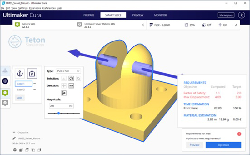 測(cè)試零件功能時(shí),常需要來會(huì)進(jìn)行修改,過程中需花費(fèi)大量時(shí)間、材料;使用者可以下載升級(jí)版的外掛,並導(dǎo)入Cura Enterprise中,多樣化的外掛功能,可以最少的材料量,完成高效率的生產(chǎn),並加速工業(yè)工具更換、維持穩(wěn)定生產(chǎn),例如:Ultimaker與Teton Simulation最新合作的「智能切片系統(tǒng)Smart Slice」。