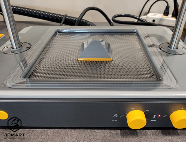首先將成型材料片的薄膜撕除,放入FormBox後置於上方的加熱管加熱,到達(dá)所需溫度後FormBox會(huì)發(fā)出提示;這時(shí)將材料片下壓,連接的吸塵器會(huì)在下壓同時(shí)自動(dòng)運(yùn)作達(dá)到真空成型的吸塑效果。