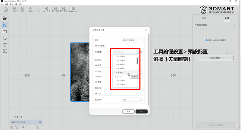 1. 「處理」>「創(chuàng)建工具路徑」/「預(yù)設(shè)配置」中選擇:矢量雕刻