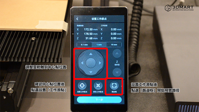 將雕刻材料固定於平臺中央,確認(rèn)「對焦紅點(diǎn)」是否出現(xiàn)在物件表面,機(jī)器將自動偵測材料厚度,並將結(jié)果立即顯示在觸控螢?zāi)簧?,確認(rèn)材料厚度無誤,系統(tǒng)將自動完成對焦。開始雷射雕刻前,機(jī)器會以藍(lán)光預(yù)覽雕刻路徑,使用觸控螢?zāi)簧系募^,調(diào)整藍(lán)光位置直到符合需求的位置,設(shè)定3步驟: