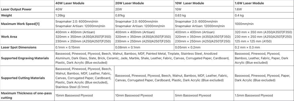 從那時(shí)開(kāi)始,Snapmaker根據(jù)技術(shù)的允許迅速升級(jí)了雷射模組。雷射功率在過(guò)去的6年內(nèi)增加了近200倍,從約5W增加到40W。由於這些升級(jí),支持的材料數(shù)量也從約5種增加到20多種。切割能力也大大提高,從幾乎無(wú)法切割到能夠切割15mm的楓木薄板。
