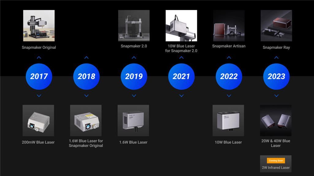 你可能已經(jīng)知道Snapmaker是因其旗艦型號(hào)的3合1 3D列印機(jī)和創(chuàng)新的模塊化設(shè)計(jì)而聞名。此外,由於桌面3D列印機(jī)市場(chǎng)已變得更加成熟,並且3D列印機(jī)在製作者中越來(lái)越常見(jiàn),3D列印功能不可避免地會(huì)擠壓雷射和CNC功能。然而,事實(shí)是,Snapmaker在設(shè)計(jì)和生產(chǎn)雷射相關(guān)產(chǎn)品上所花費(fèi)的時(shí)間與3D列印產(chǎn)品一樣多。用戶和Snapmaker一樣喜愛(ài)雷射功能。將近30%的3合1用戶定期使用雷射功能進(jìn)行創(chuàng)意項(xiàng)目。直到今年初,Snapmaker才注意到他們?cè)谠O(shè)計(jì)和生產(chǎn)優(yōu)質(zhì)雷射產(chǎn)品方面已有6年以上的經(jīng)驗(yàn)?;仡櫾?017年構(gòu)想的產(chǎn)品路線圖,Snapmaker認(rèn)為現(xiàn)在是發(fā)布獨(dú)立雷射機(jī)的合適時(shí)機(jī)。