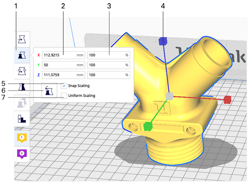 Ultimaker Cura的調整功能,使您能夠有效的在工作介面上縮放、旋轉3D模型。