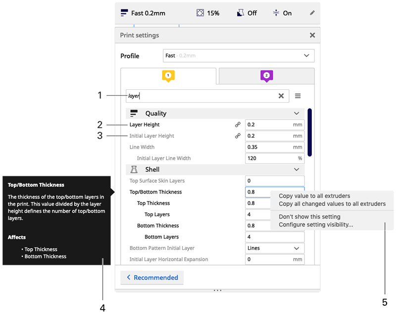 Ultimaker Cura的設定面板中有推薦與自訂模式,推薦模式適用於初學者,而自訂模式能為有經(jīng)驗的用戶提供更多的設定。