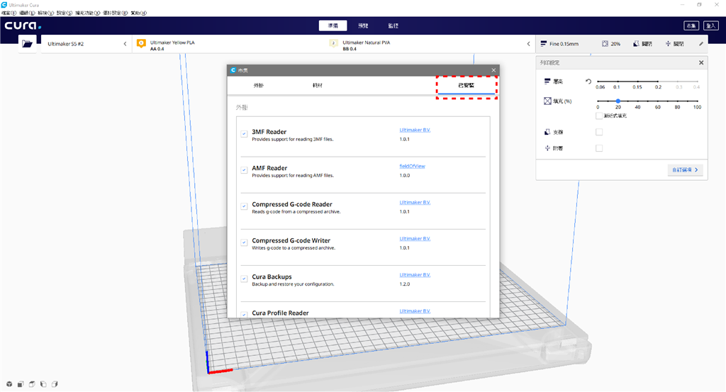 (點(diǎn)選Ultimaker 「市集」中的「外掛」選單,點(diǎn)選安裝就能下載想要的外掛功能。)