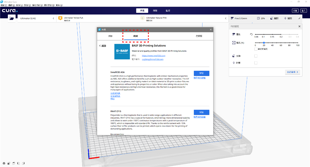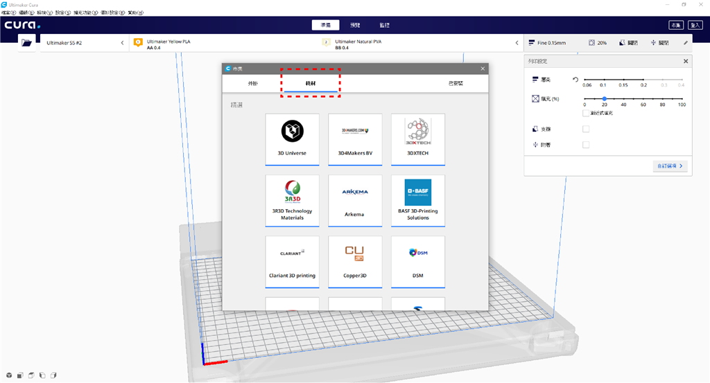 (在「市集」的「耗材」選單中可以看到各式新增的材料聯(lián)盟廠商及其提供的線材資料,並可以免費(fèi)在此下載Ultimaker專用的官方列印參數(shù))
