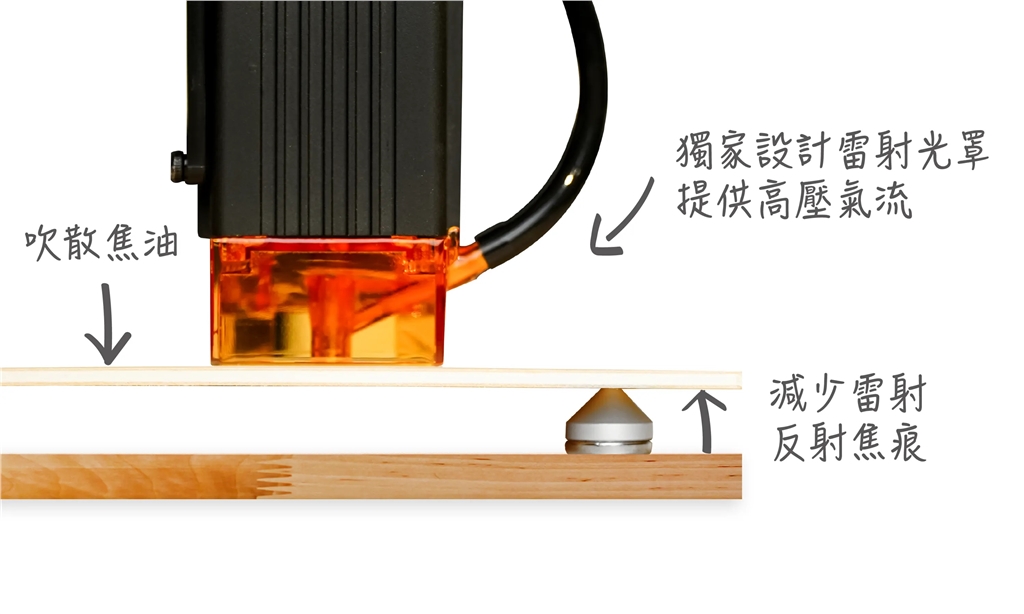 FLUX Lazervida 吹氣套件 Lazervida吹氣套件獨(dú)家設(shè)計(jì)雷射光罩,優(yōu)化空氣流道,增強(qiáng)吹氣風(fēng)量,有效吹散正面粉塵與煙霧。墊高圓錐有效協(xié)助避免雷射時(shí)材料背面產(chǎn)生的反射焦痕。雙重搭配提供更精緻雷雕雷切作品。