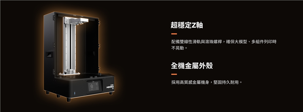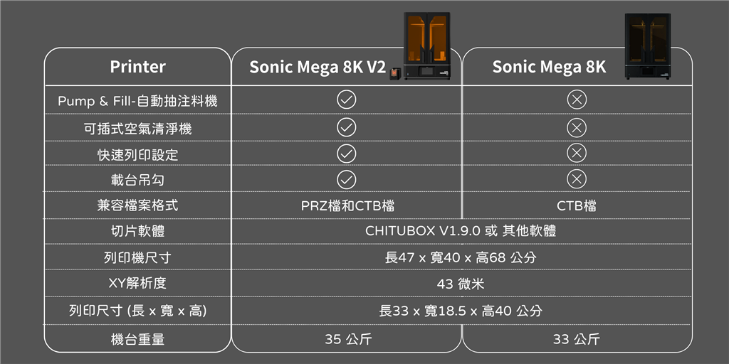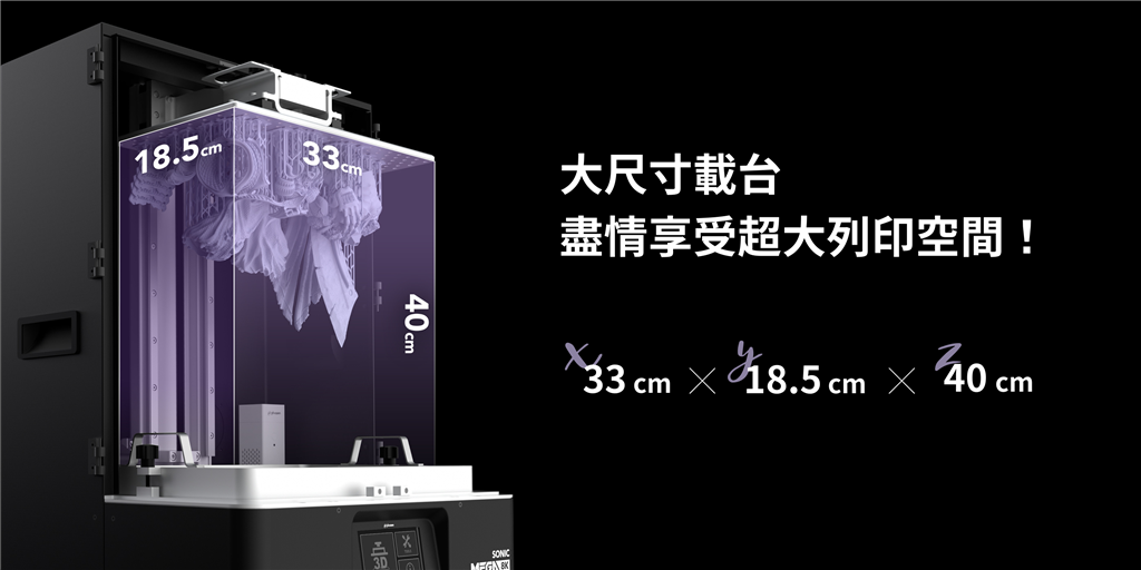 Sonic Mega 8K V2 擁有超大尺寸載臺 33 x 18.5 公分與超高40公分Z軸,一次完成超大尺寸或多分件模型,無需分次列印。